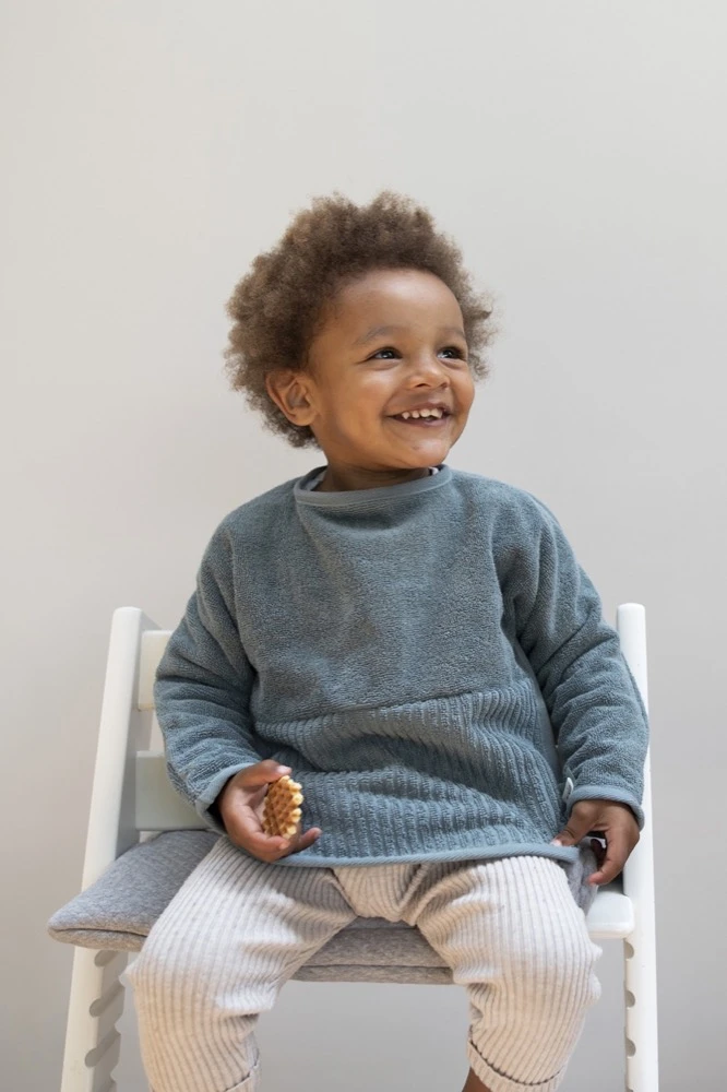 The must-have for a carefree meal! The bib with long sleeves makes sure your little one’s outfit stays clean during mealtime. The terry fabric is well-absorbent and incredibly soft. Thanks to the two push buttons, you can wear the bib in two different sizes. Have a cosy meal!