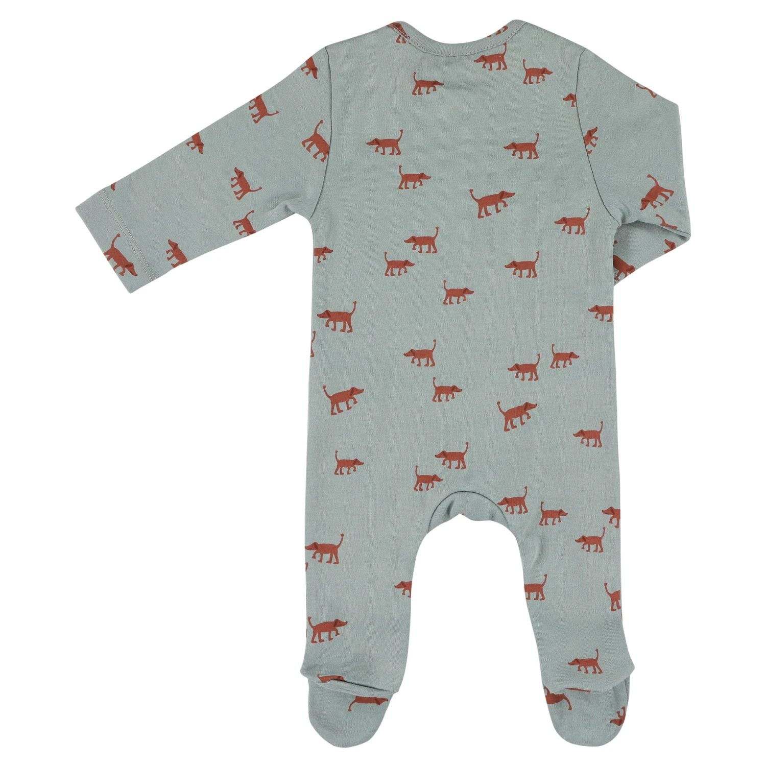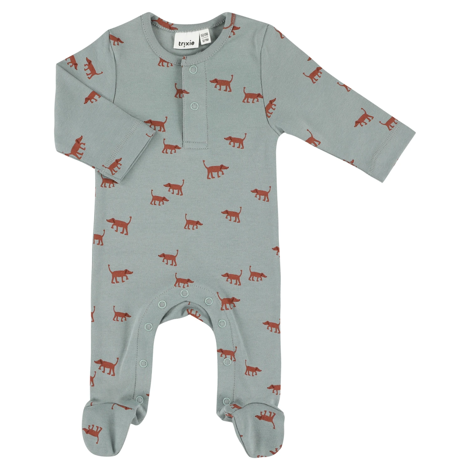 Onesie with feet for a 0-1 month year old baby by Trixie in collection Playful Pup. A way too cute long one piece that your child can sleep in, but also crawl around and play in. The onesie out of 100% organic cotton absorbs like no other and looks good, even after multiple washes.
