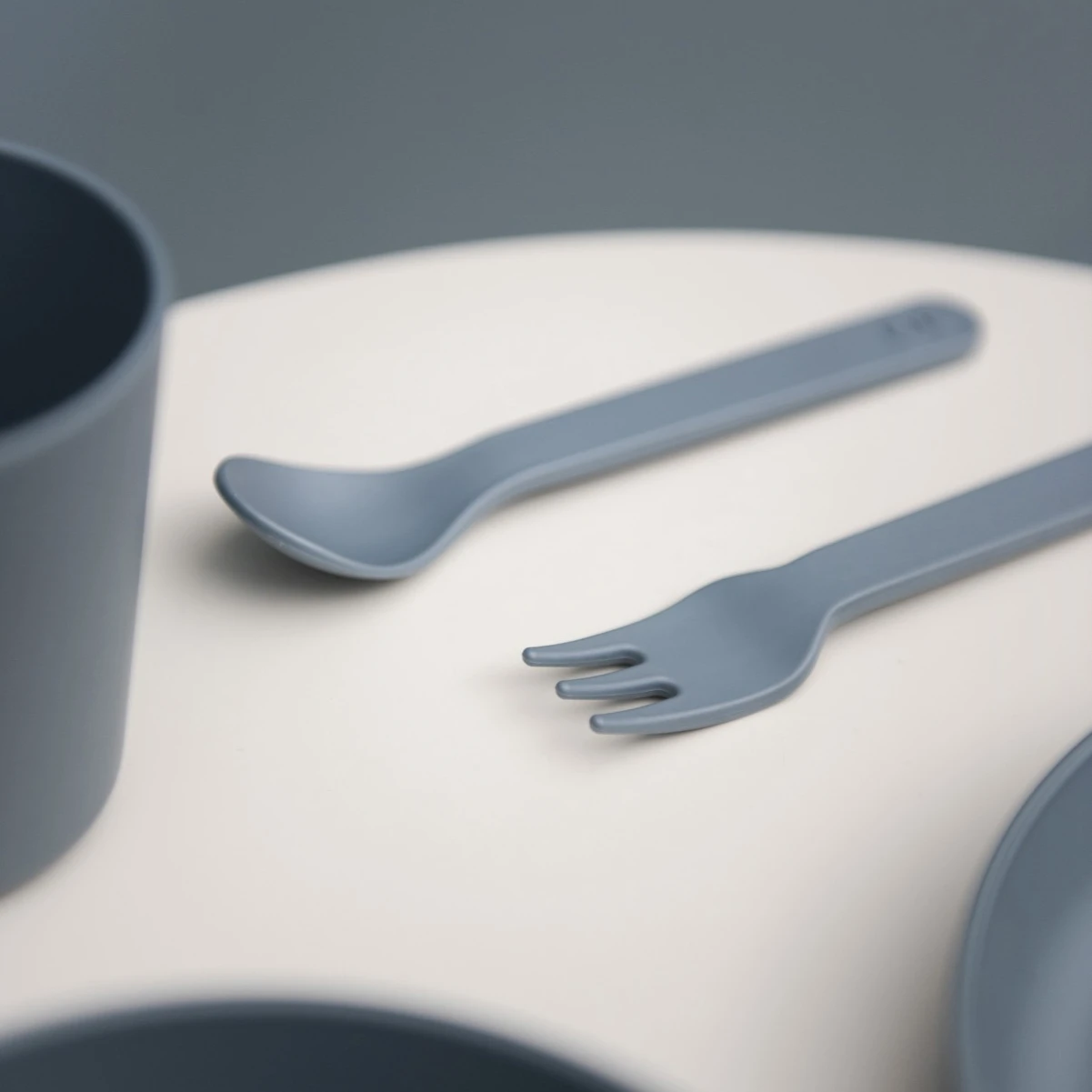 Create a cosy setting at the table with this cutlery of plant-based plastic. The set comprises two different colours that match nicely. The spoon and fork are perfect for little children’s hands. The plant-based tableware range also comprises plates, bowls and cups to complete your table setting. The design of this range matches the needs of young parents and children. All items are stackable, dishwasher safe and can be used for short microwave heat-ups. The plate has a high rim to make scooping easier for children learning to eat by themselves. The wide handles on the bowl are handy when you feed your little one and will come in great when kids start to hold the bowl themselves. The cup is the perfect size for toddlers. The range of tableware is made of plant-based plastic. This material is called PLA which stands for PolyLactic Acid. It is made from renewable, biological resources (like corn, sugar cane, agricultural waste, etc) instead of petroleum. The production of PLA uses less energy than conventional plastics and the material contains no toxins. The material can be recycled and is biodegradable under industrial circumstances. When the correct end-of-life scenario is followed, the impact on the environment is reduced to a minimum. It is LFGB proof and does not contain BPA or melamine.